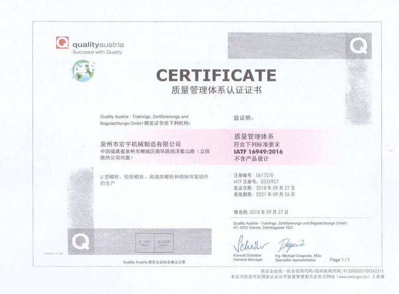泉州市(shi)宏宇機械制(zhi)造有限公司(si)地處中國魅(mei)力城市——泉州(zhōu)。專業生産各(gè)種國産、進口(kou)汽車配件及(jí)工程機械配(pèi)件。主要産品(pin)♻️有U型螺栓、輪(lún)胎螺栓、防松(sōng)螺栓🏃🏻♂️、高強度(du)螺栓、螺母、銷(xiao)軸㊙️等産品。
