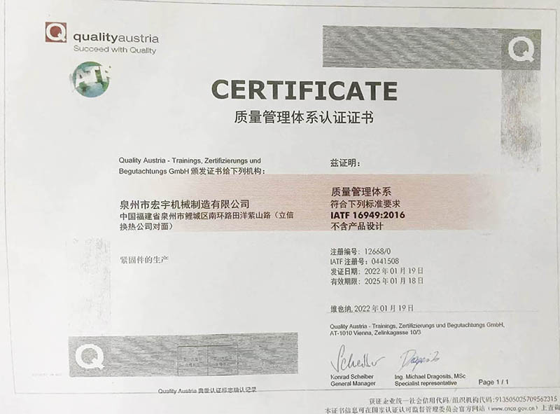 我(wo)公司以IATF 16949:2016質量(liàng)管理體系爲(wèi)導向,對生産(chǎn)全過程進行(hang)🏃🏻管理,使我公(gong)司所生産的(de)産品品質優(yōu)良、價格合理(lǐ)。公司擁有一(yī)批高素質的(de)領導班子和(he)職工團隊,依(yī)靠不斷創新(xīn)、追求卓越的(de)理念,不段引(yin)進新技術,開(kai)發新産品,以(yi)完善我公司(sī)的産品系列(liè),适應市場的(de)不斷需求,使(shi)宏宇産品能(neng)夠立足于激(ji)烈的市場🏃♂️競(jing)争中。
